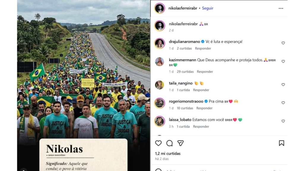 Entre as placas empunhadas pelos manifestantes artificiais atrás de Nikolas, aparecem slogans como “JUHHOM E MO NA SE!!” e “GCCORDA DE VIEOD ENIORAMZAL BRASIA”. Veja a publicação abaixo: