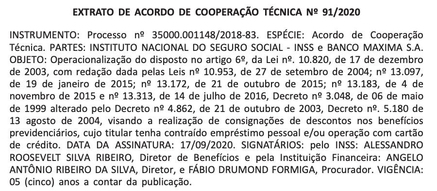 Trata-se do extrato de um Acordo de Cooperação Técnica (ACT) assinado pelo governo Bolsonaro com o então Banco Máxima, que se tornou o Master, com o INSS. O documento foi assinado em 2020, no governo Bolsonaro, portanto, com vigência de 5 anos.
