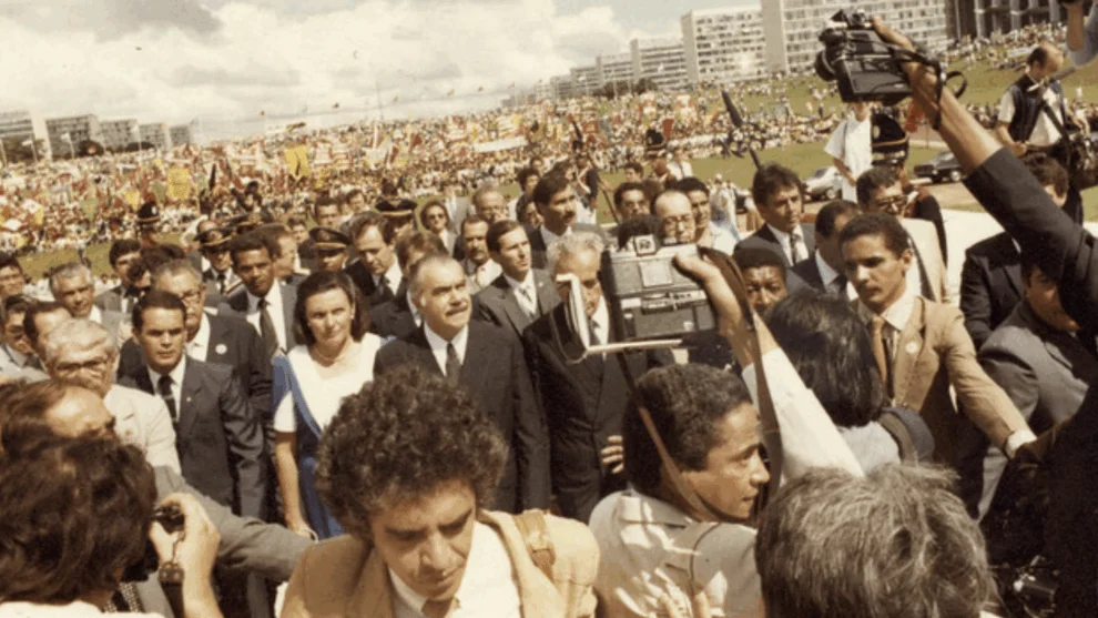 A foto acima mostra o momento em que Sarney sobe a rampa do Planalto para tomar posse em 15 de março de 1985, marcando o início da Nova República.