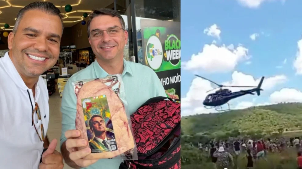 Dias antes de distribuir cortes de picanha com a foto de Flávio Bolsonaro para banhistas em Angra dos Reis, o empresário Leandro Batista Nóbrega fez uma “ação de Natal” bem menos personalizada. Dono do frigorífico Goiás, ele lançou picanhas de um helicóptero, na periferia de Goiânia, para moradores que corriam desesperadamente para pegá-las.